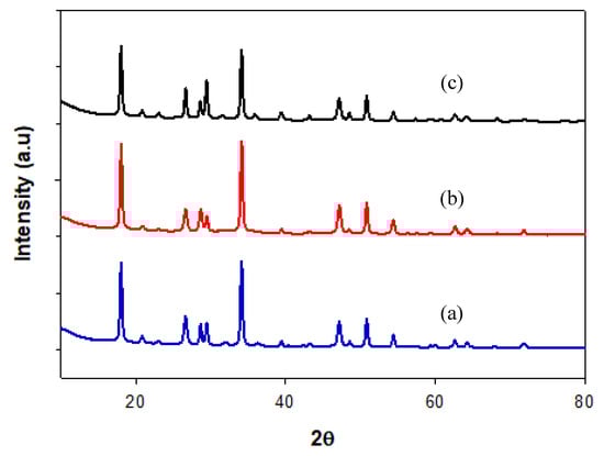 XRD diffractogram of CaO/PMFA calcinated at 900 °C for 3 h at different dehydration times of (a) 2, (b) 3, and (c) 4 h.