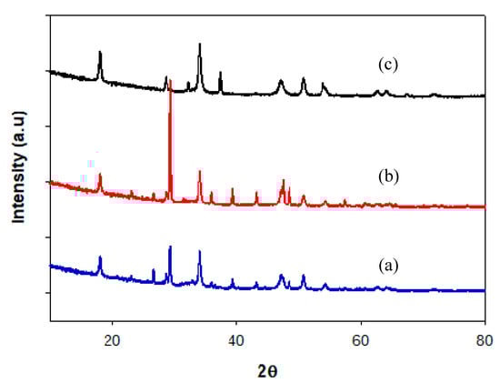 XRD pattern of catalyst CaO/PMFA calcinated at 900 °C with various dehydration temperatures of (a) 500, (b) 600, and (c) 700 °C for 3 h.