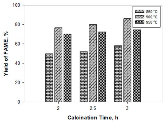 It can be found that the lowest yield of biodiesel (49.98%) was obtained from transesterification using the catalyst calcinated at 850 °C for 2 h. Meanwhile, the highest yield (86.2%) was obtained when CaO/PMFA-900/3 h was employed. In accordance with the work of Marinković et al. [66], the catalytic activity of the CaO catalysts is proportional to the number of catalyst base sites that could be reached by loading CaO into alkali compounds or metal oxides. Therefore, the high yield of biodiesel obtained by using CaO/PMFA is due to an increased number of catalyst base sides, and the activity of the CaO/FAs catalyst also increases, thus affording a higher yield. CaO, which is carried into metal oxide, has better catalytic performance compared to CaO alone, as represented by its chemical properties and texture. In addition, due to the bond between the carried CaO, the catalyst’s stability increases the effects of water and FFA, which can cause leaching [66].