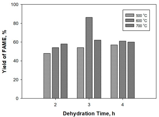 A different phenomenon can be seen in Figure 6. Because the CaO/FA-900/3 h catalyst resulted from a temperature of 600 °C and a 3-h-long dehydration, it possessed higher Ca2SiO4 and CaO contents than the other catalysts. Moreover, it had the strongest basic strength. This result is in line with the work of Kesica at al. [63], who stated that the stronger the base, the higher the catalytic activity. The optimum yield obtained was 86.2% at 600 °C for 3 h. As the temperature and dehydration time of the catalyst increase, the catalyst gradually changed into a stable crystal and increased its specific area. However, the biodiesel yield decreased after passing the optimum conditions at a temperature of 600 °C for 3 h.
