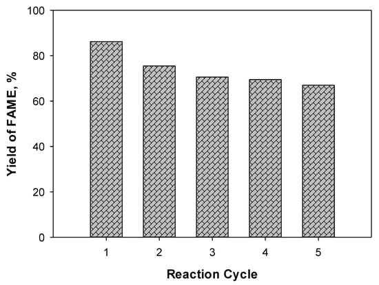 Figure 8 presents the percentage of the yielded FAME for five cycles of CaO/PMFA-900-600 usage to evaluate the reusability of the catalyst. Note that in order to begin each new run, the liquid was removed, leaving the catalyst deposition to be retrieved later. After the first cycle, the catalyst experienced a significant deactivation (from 86.20% to 75.47%). The catalytic activity continued to decrease afterward; even after the fifth cycle, saturation was not observed. These results simply suggest continuous deactivation of the catalyst following the reaction cycle.
