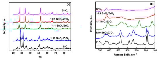 (a) X-ray diffraction patterns and (b) ambient temperature Raman spectra of sulfated single as well as mixed (SO42−) SnO2/ZrO2 oxides.