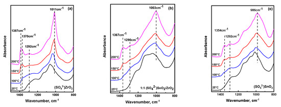 Figure 4 shows temperature dependent ATR-IR spectra of the S-ZrO2, 1:1 S-SnO2/ZrO2, and S-SnO2 up to 200 °C (close to the temperature limit of the ATR setup). The corresponding spectra for 1:10 S-SnO2/ZrO2 and 10:1 S-SnO2/ZrO2 catalysts are shown in the Supporting Information. The spectra shown in Figure 4 pertain to materials that have been calcined at 500–600 °C and then left at ambient conditions. By comparing the spectra of Figure 3a and Figure 4a–c at 25 °C, it is observed that, after calcination, the main peaks are shifted to higher wavenumbers due to the formation of covalent bonds. In addition, these spectral changes can be also ascribed to the much smaller extent of available surface hydroxyl groups (after calcination) that directly interact with sulfate species, thus weakening the S–O bonds and consequently shifting the bands to lower wavenumbers [41,53]. Upon heating, in the case of S–ZrO2, a gradual evolution of a band at 1010 cm−1 is observed, indicative of the S–O…Zr stretching vibration of anchoring bonds [7]. However, the broad character of this band underscores that a range of S-O bonds exists with varying length, strength, and bond order [39]. In addition, characteristic S=O stretches of sulfate species are exhibited within the 1360–1390 cm−1 range, with a clear contribution of two distinct peaks located at 1370 and 1387 cm−1; the 1387 cm−1 band evolves at the expense of that at 1370 cm−1 upon heating, which indicates a plausible transformation between sulfate species with similar molecular structure. The increase in intensity of the 1387 cm−1 S=O stretching band is accompanied by a gradual increase of a band around ~1290 cm−1, which has been previously ascribed to the possibility of the di-oxo O=S=O symmetric stretch of bidentate sulfate species [25,35,39] or the S=O stretching mode of S2O72− units adsorbed on a slightly hydrated surface [39,41]. At low temperatures, according to a DFT study, di-oxo type sulfate units may exist [40], but clear evidence for such species cannot be derived from these experiments.