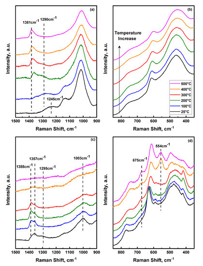 Temperature dependent Raman spectra of the (a,b) 1:1 (SO42−)SnO2/ZrO2, and (c,d) (SO42−)SnO2 up to 500 °C. Acquisition time was set to 60 secs, while 32 accumulations have been used to increase signal/noise ratio. A 10X long working distance objective was used at a slight defocused mode to avoid local overheating.