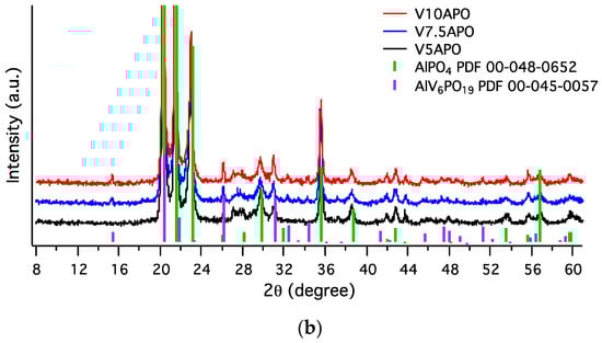 X-ray diffraction patterns of all samples are illustrated in Figure 1. A highly crystalline structure for all studied samples was observed, but with a low surface area, as evidenced by nitrogen adsorption isotherms (Table 1). The four main diffraction lines at 2θ of 20.32°, 21.48°, 23.00° and 35.54° correspond to (020), (211), (212) and (107) planes of orthorhombic AlPO4 phases (Joint Committee on Powder Diffraction Standards (JCPDS) Card No. 00-048-0652), respectively. As it can be observed in Table 1 for all samples, the three lattice parameters (a, b and c) have increased values reported to AlPO4, which means that during vanadium insertion, a lattice expansion occurred. This can take place when pentavalent vanadium ion (0.68 Å) replaced the pentavalent phosphorus ion with a smaller dimension (0.305 Å). This also indicates that vanadium was successfully incorporated into the framework. Moreover, additional lines located at 2θ of 15.4°, 26.2° and 31.1° correspond to a polymeric orthorhombic AlV6PO19 phase (Powder Diffraction File (PDF) card 00-045-0057) as highlighted in the XRD patterns. However, the vanadium insertion does not influence the AlPO4 crystallinity. It was also observed that increasing the V loading in AlPO, slightly increases the crystallite size, from 35 nm to 37 nm, for V5APO to V10APO, respectively (Table 1), probably due to the increase of polymeric vanadium phase, as evidenced further by Raman data for higher vanadium loadings.