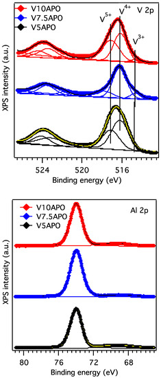 High resolution XP spectra of O 1s, V 2p, Al 2p and P 2p for VAPO samples are presented in Figure 4, while the surface composition and the binding energies values are shown in Table 2. The O 1s core level taken at 531.3 eV for phosphate (PO4)2− and 530.0 eV for VOx was used as an internal binding energy reference according to Silversmit’s recommendations [39].