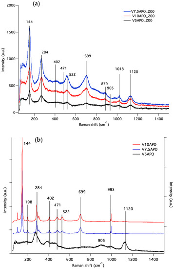 Within the Figure 5a, the presence of the Raman band(s) at: (i) 144 cm−1 is related to a –V–O–V–O–V– skeleton bent vibration and denotes a layer like structure as observed in V2O5 orthorhombic structure [48,49], (ii) 284 and 402 cm−1 can be assigned to V=O bend vibrations modes, (iii) 471 and 699 cm−1 correspond to the internal V–O–V bending and stretching modes, respectively, while, (iv) 310 and 522 cm−1 are associated to V–O bending and stretching modes along the c-axis, respectively. All of the Raman bands were slightly shifted from that of the V2O5 orthorhombic structure, probably due to the new configuration of V within the AlPO4 structure. For all three samples thermally treated at 200 °C, but more intensively in the case of V7.5APO and V10APO the characteristic Raman modes for V4+=O and V5+=O found in amorphous phase at 879 and 1018 cm−1, respectively were observed.