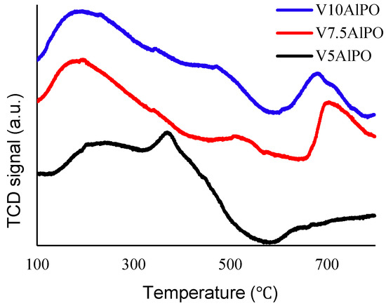 Temperature Programmed Desorption (TPD) profiles showed three distinct regions: One between 200–250 °C that correspond to weak acid sites from surface hydroxyl groups, one with peaks between 350–450 °C and correspond possibly to Brønsted acid sites of moderate acidity, while the one from 500–700 °C corresponds to strong acid sites. The sample containing the highest content of V possess also the highest number of acid sites (see Table 3). This behavior is in agreement with other reports, [50], that found also an increase of the acidity strength with vanadium loading.