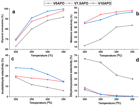 Glycerol conversion increased with the increase in temperature of reaction, as expected, from 200 to 350 °C, and the amount of V incorporated in AlPO played an important role in the activity of the catalyst, thus, V10APO showed the best glycerol conversion followed by V7.5APO and V5APO, respectively.