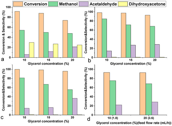The influence of glycerol concentration on the glycerol conversion and the products distribution are shown in Figure 9a–c. A slightly decrease in the conversion, with the increase of the glycerol concentration in water from 10% to 20%, was noted for all catalysts. In the same time, the selectivity to methanol decreases with increasing glycerol concentration, with the highest values observed again over the V7.5APO catalyst. Conversely, the acetaldehyde production increase with glycerol concentration. In this moment we do not have experimental details to give a plausible explanation. However, this result is in line with data from the literature that also revealed that higher glycerol concentrations in the feed resulted in a significant increase in the quantity of side products [27].