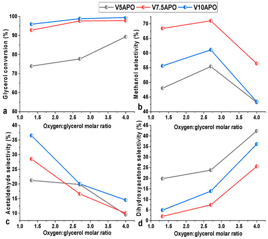 To check the contribution of selective oxidation, different O2 to glycerol ratio were studied. The influence of oxygen to glycerol ratio, at 20% glycerol concentration and 350 °C, over conversion and selectivity is depicted in Figure 10. The glycerol conversion was increasing with O2 to glycerol ratio for all studied samples, V7.5APO and V10APO presenting the highest and similar conversions. This agrees with other studies [60,61], which revealed the importance of O2 to increase the conversion. The total conversion was reached when O2 to glycerol ratio was four. Conversely, increasing the O2 to glycerol ratio determined a decrease in the selectivity to dehydration products. Therefore, the selectivity to acetaldehyde was diminishing with the increase of O2 to glycerol ratio, while the selectivity to methanol followed a volcano curve, irrespective to the V loading, with a maximum selectivity of 70% for V7.5APO and O2 to glycerol ratio of 2.7. Further increase of O2 to glycerol ratio is detrimental to methanol production, while the formation of dihydroxyacetone increased. This indicates that for O2 to glycerol ratio higher than 2.7 the contribution of selective oxidation was in a larger extent as compared with dehydration/hydrogenolysis reaction.