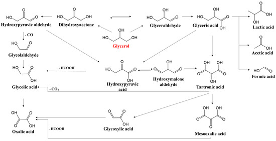 The catalytic glycerol oxidation occurs by a complex mechanism and conducts to many products such as formic acid [6], acrolein [7], acrylic acid [8,9], glycolic acid [10], glyoxylic acid, glyceric acid [11], glyceraldehyde and dihydroxyacetone [12,13] (see Scheme 1) [6]. These products have many uses in the chemical industry, e.g., dihydroxyacetone can be used in cosmetics industry; glyceric acid for detergents [14]; formic acid is used as a hydrogen carrier [15]; and acrylic acid is used mainly in the production of acrylic esters and resins used in coatings and adhesives [16].