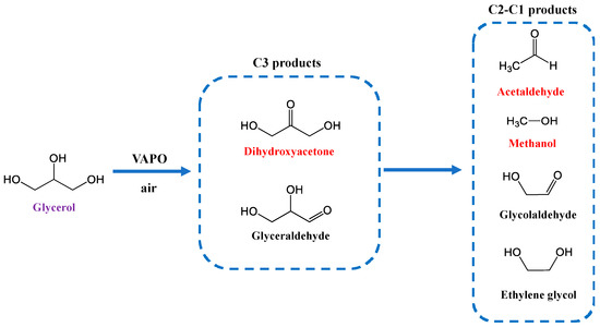 Simplified reaction pathways for glycerol transformation on VAPO catalysts. Major reaction products are noted in red color.