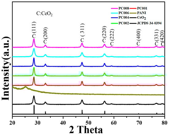 The phase identification and crystal structure of the material can be performed by XRD analysis. Figure 1 shows the XRD patterns of the CeO2/PANI composite powders as a function of the amount of PANI coating. Note that both the as-synthesized CeO2 powder and the samples with PANI conformed to JCPSD 34-0394, showing a cubic fluorite structure, which is consistent with the literature [39]. No significant shift in diffraction peaks of the CeO2 powder can be found after coating PANI, showing that the polymerization of PANI did not cause a change in the lattice of CeO2. Moreover, no diffraction peaks of PANI were found in any of the CeO2/PANI composite powders. It is likely due to the low crystallinity and low concentration of the coated PANI. The presence of PANI will be further verified by FTIR analysis.