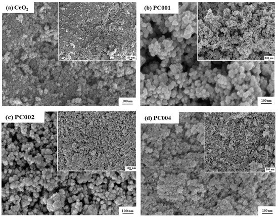 The surface morphology of the composite powders can be observed by FE-SEM analysis. Figure 2 shows the SEM images of the CeO2/PANI powder as a function of coated PANI concentration. As shown in Figure 2a, the CeO2 powder prepared by the precipitation method was rounded in shape and exhibited a particle size distribution in the range of 20–30 nm. However, the particle size increased after a small amount of PANI was coated. Subsequently, it showed a tendency of agglomeration as the PANI coating increased by more than 4 wt %. In order to determine the particle size distribution more clearly, TEM results are shown for further analysis.