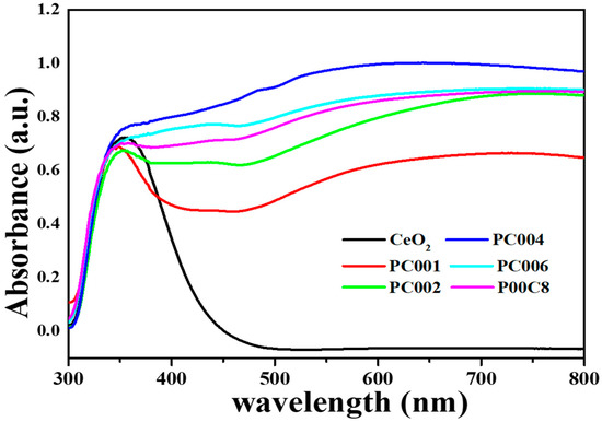 Figure 5 shows the UV-Vis curves of the CeO2/PANI powder as a function of coated PANI concentration. Note that the plain CeO2 powder predominantly absorbs ultraviolet light to form electron-hole pairs in the wavelength range of <400 nm due to its large energy band gap, showing almost no absorption in the wavelength region of visible light (400–700 nm). In contrast, the samples with PANI coating all showed an improvement in the absorption of visible light. Among them, 4 wt % PANI-coated CeO2 powder exhibited the best visible light absorption capacity, demonstrating that the light absorption range of CeO2 can be extended to the visible light region by coating with PANI, thereby improving the photocatalytic activity. When the amount of PANI coating increased to 6–8 wt %, the light absorption capacity regressed, likely due to the formation of particle agglomeration from an excessive coating of PANI, causing a reduction in the visible light absorption capacity.