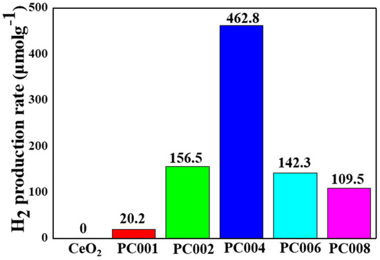 It has been demonstrated that the separation of photogenerated electron-hole pairs can be effectively enhanced due to the formation of a heterostructure, the so-called p–n junction, at the interface between n-type CeO2 and p-type PANI [49,50]. Figure 8 shows the comparison of the hydrogen production activity by photocatalytic water splitting of the heterostructured CeO2/PANI powder as a function of the amount of PANI coating after 6 h of visible light irradiation. Note that the uncoated CeO2 powder exhibited no activity of hydrogen production after 6 h of irradiation. That is to say the CeO2 powder has no photocatalytic activity under visible light irradiation. This implies that the CeO2 with a large energy band gap, which cannot be excited by visible light irradiation, can only produce hydrogen under UV light. Compared to the unaltered form, the CeO2 powder showed better photocatalytic hydrogen production after adding PANI. Among them, the PC004 exhibited the highest hydrogen production efficiency, attaining a value of 462.8 μmolg−1 after 6 h of visible light irradiation. The increase in photocatalytic activity can be attributed to the deposition of PANI, which can enhance the absorption of energy in the visible light region and facilitate the separation of photo-generated electron-hole pairs while inhibiting the rate of their recombination. However, when increasing the amount of PANI added to 6 wt % (PC006 and PC008), the hydrogen production effect began to decrease. It is speculated that the main reason for this is that the excessive addition of PANI caused agglomeration on the surface of the CeO2 powder during the preparation process, which tends to reduce the active sites of the reaction and thus decreased the photocatalytic activity.