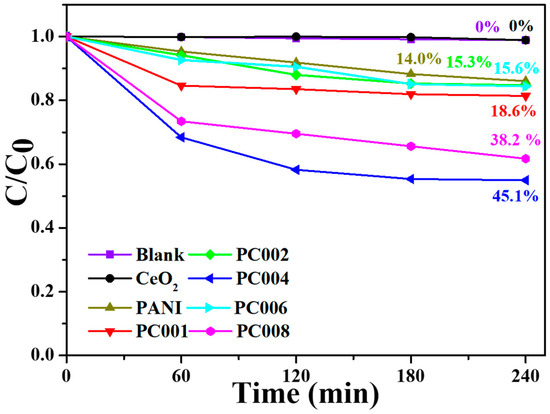The photocatalytic performance of the heterostructured CeO2/PANI powders was also evaluated by degrading the methylene orange (MO) under visible light irradiation. Figure 9 shows the MO photodegradation curves of the CeO2/PANI composite powders under visible light irradiation as a function of the amount of PANI coating. However, physical adsorption may occur during the process. All degradation curves of the composite powders under visible light irradiation are thus presented after deducting the physical adsorption effect by a 30-min dark adsorption before illumination. It should be noted that, without photocatalyst, MO degradation was confirmed to be negligible under visible light irradiation, see the “blank” curve. Similarly, no degradation effect of the uncoated CeO2 powder can be found under visible light irradiation due to its large energy band gap (~3.2 eV) which can only be activated by UV light. Compared with the uncoated CeO2 and PANI powders, the photodegradation effect of all samples coated with PANI is improved. Note that the highest photocatalytic activity is shown by the CeO2 powder coated with 4 wt % PANI; exhibiting a MO photodegradation of 45.1% after 4 h of visible light irradiation. Similar synergistic effects can also be found in other composite systems of PANI/BiOI [50], PANI/BiOBr [51] and PANI/BiOCl [31]. This can be attributed to the presence of PANI, which increases the photogenerated electron-hole separation and inhibits the recombination rate, thereby improving the photocatalytic activity of the CeO2 powder.