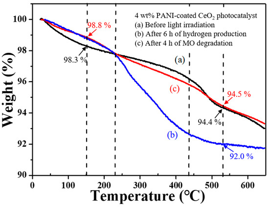 In order to investigate the recyclability of optimized photocatalysts, 4 wt % PANI-coated CeO2 powder were used for four photocatalytic cycles of hydrogen production and MO degradation. After each photocatalytic reaction, the photocatalyst was separated, washed and dried, and used for further run without any treatment. Figure 10 shows the recycling tests of the PC004 photocatalyst for hydrogen production and MO degradation under visible light irradiation. For comparison with the data above, each cycle of hydrogen production and MO degradation lasted 6 h and 4 h, respectively. Note that both hydrogen production efficiency and MO degradation decreased as the cycle number increased. The hydrogen production efficiencies of the four cycles were 462.8, 371.2, 289.6, and 189.2 μmolg−1 in sequence, while the MO degradation rates were 45.1%, 38.9%, 35.8%, and 33.7% in sequence, showing better stability of the photodegradation reaction. Compared with the first cycle, the hydrogen production efficiency was reduced by 60% after four cycles, while the MO degradation capability was only reduced by 25%. This is most likely attributed to the photocatalytic reaction between hydrogen production and MO degradation occurring at different sites on the catalyst surface. In addition, since PANI is an organic compound, radicals, generated by light irradiation, might induce PANI degradation [52], which may significantly decrease stability of the photocatalyst. Figure 11 shows the TGA (thermogravimetric analysis) curves of the PC004 before irradiation, after 6 h of hydrogen production and 4 h of MO degradation under visible light irradiation. Note that four different weight loss mechanisms took place in temperature ranges of 25°–150°, 150°–230°, 230°–440°, and 440°–530 °C. The first two weight losses were mainly attributed to water evaporation and elimination of impurities. The weight loss in temperature range 230–440 °C was attributed to the structural decomposition of the PANI and degradation of some oligomers [53], whereas the weight loss in temperature 440–530 °C was due to the loss of PANI main chain [54]. A comparison among the values at 150 °C, the weight losses of the sample before irradiation, after hydrogen production, and MO degradation were 3.9%, 6.8%, and 4.3%, respectively. The weight loss before irradiation was consistent with the amount of PANI coated in the composite powder, while the curves (b) and (c) of the composite powder after both photocatalytic reactions showed no significant PANI loss during the photocatalytic process. This indicates that the CeO2/PANI powder did not experience any significant PANI degradation during the photocatalytic reaction. However, the obvious increase in weight of curve (b) after the reaction does not exclude that it might be due to the complex reaction involved between the sacrificial reagent and the photocatalyst during hydrogen production, although the reaction mechanism remains unclear. The slight increase in weight of curve (c) was most likely due to the adsorption of a small amount of organic substances during the MO degradation. These factors can mainly lead to a decrease in stability of the photocatalyst.