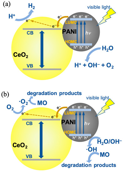 Figure 12 shows a schematic diagram of the hydrogen production and MO degradation mechanisms of the CeO2/PANI powders under visible light irradiation. In the case of hydrogen production, in Figure 12a, when visible light irradiates the surface of a composite photocatalyst, the electrons of PANI are excited to transfer from the HOMO (highest occupied molecular orbital) to the LUMO (lowest unoccupied molecular orbital), leaving holes in the HOMO [55,56,57]. As seen in Figure 5, the PANI can absorb visible light and produce photogenerated electrons and holes under visible light irradiation in this system. Such electrons in LUMO will spontaneously transfer to the conduction band (CB) of CeO2, though CeO2 cannot be excited by visible light. Such effect stimulates a more effective separation process of electron-hole pairs, which inhibits the recombination of charge carriers and enhances the photocatalytic activity. The photogenerated holes then decompose H2O into H+ and OH−, and the electrons are combined with H+ to produce H2. Furthermore, the MO degradation mechanism of the CeO2/PANI powders is shown in Figure 12b. In the same manner, the PANI with a closer HOMO-LUMO gap absorbs visible light to produce electron-hole pairs. The electrons are first excited from the HOMO to the LUMO and the holes are formed in the HOMO. The photogenerated electrons in LUMO then transfer to the CB of the CeO2 catalyst and combine with oxygen (O2) to form superoxide anion radicals (·O2−). The holes in the HOMO will react with the hydroxide ions (OH−) to form hydroxyl radicals (·OH). Finally, although the gases released during the degradation process were not determined in this study, because MO is a quite complex molecule and may produce many other fragment ions, it has been demonstrated in literature that the MO can be decomposed into the products of gaseous dinitrogen, innocuous SO42− ions [58,59], water, and carbon dioxide [60] by the superoxide radicals (reductant) and the hydroxyl radicals (oxidant). Furthermore, according to the proposed mechanisms, the main reaction of MO degradation occurs on the surfaces of CeO2 particle and PANI, while the reaction of hydrogen production only occurs on the surface of PANI. This suggests that when both surfaces of the CeO2 and PANI are properly exposed, better photocatalytic properties can be obtained. Considering the recyclability results in Figure 10, this is a possible reason why the recyclability of MO degradation is better than that of hydrogen production. Therefore, although stability improvement remains challenging, in comparison with the uncoated CeO2 powder, heterostructured CeO2/PANI composite powders with appropriate CeO2/PANI ratio, which have a relatively good photocatalytic performance under visible light irradiation, can generate hydrogen by water splitting and degrade MO, revealing it to be a potential material for photocatalytic applications.