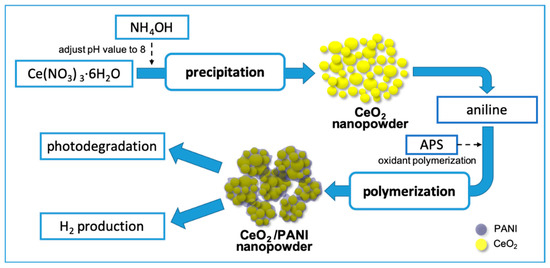 Ceria powder was homogeneously synthesized from the precursor cerium nitrate hydrate (CeNH) by the wet-chemical precipitation method [61]. Figure 13 shows the schematic diagram for the preparation of CeO2/PANI powder synthesized in this study. The concentration of precursor solution in de-ionized water was prepared at 5.0 wt %. After stirring and heating to 70 °C, aqueous ammonia was gradually added into the precursor solution to bring the pH value to ~8 for precipitation. After soaking at 70 °C for 1 h, the resulting suspension was cooled and stirred constantly at room temperature for 4 h to obtain precipitate. The precipitate was then rinsed several times and dried at 80 °C for 24 h. The as-dried powder was calcined at 500 °C for 2 h to obtain CeO2 nanopowder for the following PANI deposition.