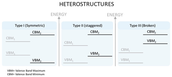 In order to improve photocatalytic properties of ZnO, different strategies have been proposed, for example, by using doping elements to improve the photoresponse range [10,11] or developing heterostructures (heterojunctions) with other semiconductors [12,13]. Based on their band alignment, heterostructures can be classified into three types (Figure 1): type I (symmetric), type II (staggered) and type III (broken). Type I heterostructures are often found in light emitting diode (LED) systems, as they promote the recombination of photogenerated electrons/holes [14]. Type II heterostructures are particularly interesting for photocatalytic applications, since they allow the respective delocalisation of photogenerated charge carriers. Holes are driven in the valence band maximum (VBM) of one semiconductor and electrons in the conduction band minimum (CBM) of the second one [15]. Consequently, photogenerated electrons/holes’ lifetimes are increased. Type III heterostructures can be applied in tunnelling field-effect transistors [16].