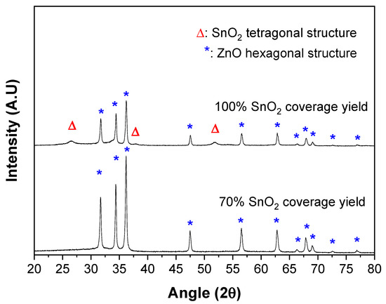 This reveals two important features when considering photocatalytic applications. Firstly, SnO2 remains transparent to UV light, so that the ZnO underneath can still be excited, generating electron/hole carriers, even when fully covered. Secondly, a 70% coverage rate of SnO2 is enough to prevent charge carriers recombination. The presence of the broad peak in the visible range can be attributed to remaining defects in the ZnO or SnO2, particularly oxygen vacancies. The annealing treatment of ZnO, as well as the growth temperature of SnO2, were limited to 300 °C because of the substrate instability above this temperature. Thus, it is likely that all oxygen vacancies were not completely eliminated [47,48].