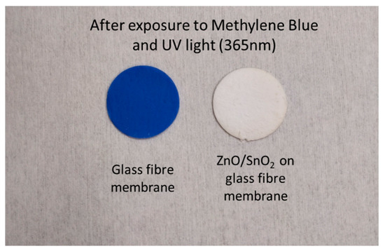 Picture of a glass fibre membrane after exposure to methylene blue (left) and glass fibre membrane functionalised with ZnO nanorods/SnO2 (70% coverage rate) (right).