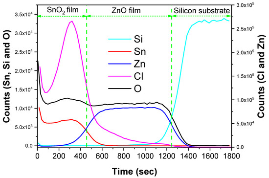 Figure 10 presents the uncalibrated concentration vs. depth of five elements tracked during the SIMS analysis: silicon, tin, zinc, chlorine and oxygen. The stack SnO2/ZnO is featured by a high contribution of tin in the first 400 s of pulverisation followed by the zinc contribution from 500 to 1200 s. The oxygen contribution remains stable along the depth profile (pulverisation time from 0 s to 1200 s). After 1200 s of pulverisation, the zinc and oxygen contributions disappear in favour of silicon corresponding to the substrate contribution. Interestingly, a high contribution of chlorine is detected in the SnO2 film. When the ZnO film is formed, the contribution of chlorine is lowered drastically. However, some chlorine is still visible in the ZnO film. This clearly evidences the fact that Cl is trapped within the SnO2 films during its growth and that it slightly diffuses into the ZnO underneath. No chlorine is detected in the substrate level.