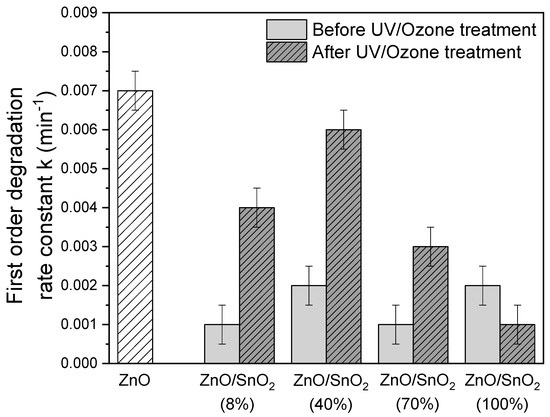 First order degradation rate constant k (min−1) of ZnO and ZnO/SnO2 photocatalysts before and after UV/Ozone cleaning.