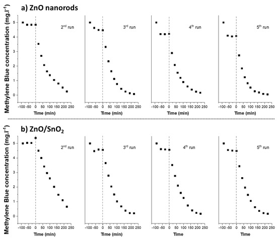 In the present case, we highlight the same protective behaviour of the ZnO/SnO2 heterostructure through reusability photocatalytic tests and SEM pictures. In Figure 13, the reusability of both ZnO (a) and ZnO/SnO2 (40%) (b) membranes after five photocatalytic degradation tests is presented. For both systems, the photocatalytic performance is slightly improved after several reuse tests. The reason for this improvement is not yet known, but it is likely that after exposure to UV for several hours, membranes surfaces get cleaner (degradation/removal of adsorbed surface carbon) and thus more reactive toward MB. Those reusability tests demonstrate the excellent performance of ZnO and ZnO/SnO2 membranes for water depollution over time.