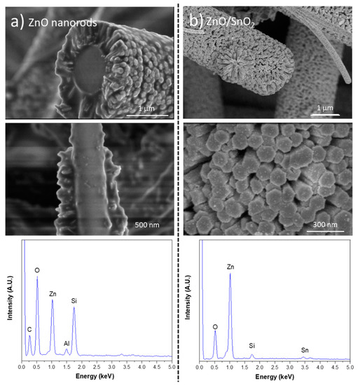 SEM images and EDX analysis of (a) ZnO nanorods and (b) ZnO/SnO2 (40%) heterostructure, after five photocatalytic degradation tests.