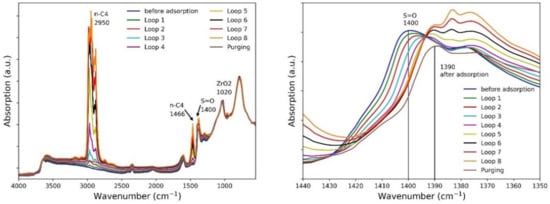 Absorption spectra before and after adsorption of n-butane on sulfated zirconia (SZ) at 308 K are shown in Figure 1. Before purging, the gas phase bands of n-butane at 2950 and 1466 cm−1 are clearly visible. The absorption maxima of the gas phase bands of n-butane increase with increasing number of n-butane injections via the loop according to the higher concentration. The change in the characteristic sulfate band at 1400 cm−1 was used to describe the SZ and n-butane interaction as well as to determine the extinction coefficients. The band at 1400 cm−1 can be assigned to the stretching vibration of the S=O bond, which is associated in the literature with a disulfate structure on the surface of the catalyst [,]. It has a double-band structure with a maximum at 1400 cm−1 and a shoulder at 1375 cm−1 with lower intensity. During the adsorption of n-butane, the S=O band is red-shifted to lower wavenumbers. The double-band structure initially remains, but the intensity decreases. Unfolding the double band resulted in a shift of 10 cm−1 for the maximum at 1400 cm−1 and about 30 cm−1 for the shoulder. From the 5th loop onwards, only the absorption maximum increases and there is no further shift of the sulfate band. This indicates a saturation of the proposed active centers. Furthermore, an isosbestic point at 1395 cm−1 can be observed, which points to a probable transformation of S=O bound in S–O–H with bounded n-butane. A red-shift of bands in the hydroxyl region about 3750 cm−1 supports these indications. However, the structure of the S=O band itself changes indicating the isomerization reaction. After 15 min of purging with nitrogen to remove physisorbed n-butane, the sulfate band is still located at 1390 cm−1, which clearly shows the adsorption of n-butane on the sulfated zirconia.