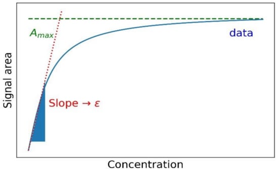 If the unit [cm−1] is assigned to the signal area, then the ratio of the maximum detected signal area Amax (occurs to the saturation of the active centers, coverage ratio X = 1) and the internal extinction coefficient ε determined from the straight line slope with the unit [cm−1 μmol−1] can be used to determine the amount of substance nadsorbed of the total gas molecules adsorbed on the catalyst in [μmol] according to Equation (3).