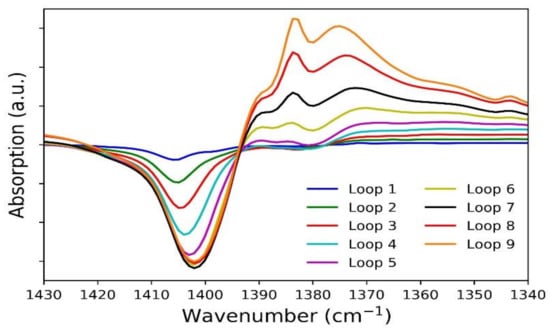 Difference spectra for adsorption n-butane on sulfated zirconia (SZ) at T = 308 K. (“Loop 1” corresponds to the difference spectrum between Loop 1 and the spectrum before adsorption and so on.).