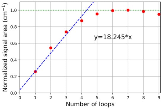 The determined signal areas are plotted against the number of loops, i.e., the n-butane concentration (Figure 5). Knowing that the doses with n-butane are in the µmol range, an internal molar decadic extinction coefficient is determined with the help of linear regression as described above. All relevant variables for the entire adsorption evaluation are summarized in Table 1. A mean decadic extinction coefficient of 60 cm−1 µmol−1 was determined by this procedure. For all experiments, only the ratio of signal area amplitude and extinction coefficient is approximately constant (see Table 1). However, the absolute values of the signal area amplitude and the extinction coefficient are subject to a large fluctuation. The determination of an unambiguous extinction coefficient is therefore only regarded as a rough approximation due to the large deviations.