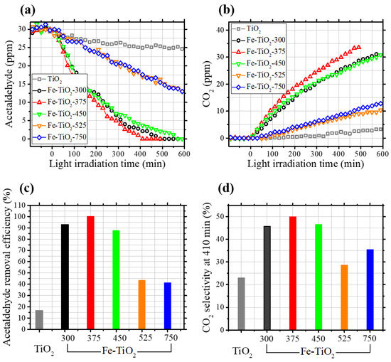 Figure 2a,b show the concentration changes of acetaldehyde and CO2 during the photocatalysis experiments under visible light irradiation. The negative time scales correspond to the pre-adsorption stage in the dark, which was performed prior to the photocatalysis experiments. No notable changes in the concentration of acetaldehyde were observed for any of the TiO2 samples (TiO2 and Fe-TiO2-300, -375, -450, -525, and -750) at the pre-adsorption stage, indicating that the adsorption of acetaldehyde in the dark was negligible for all the cases of the samples.