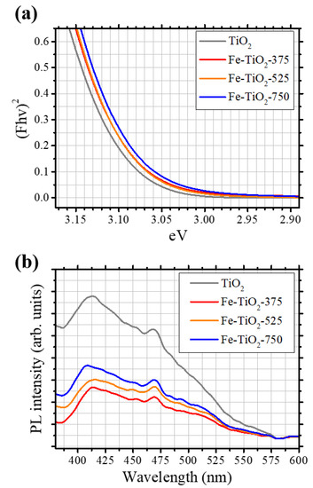 Results of UV diffuse reflectance spectrophotometry (UV-DRS) and photoluminescence (PL) analyses. (a) Kubelka–Munk plots of the results of UV-DRS measurements with TiO2 and Fe-TiO2-375, -525, and -750. (b) PL signal measured with TiO2 and Fe-TiO2-375, -525, and -750 samples.