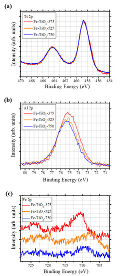 Results of XPS analysis. (a) Ti 2p, (b) Al 2p, and (c) Fe 2p core-level XPS spectra of Fe-TiO2-375, -525, and -750 samples.