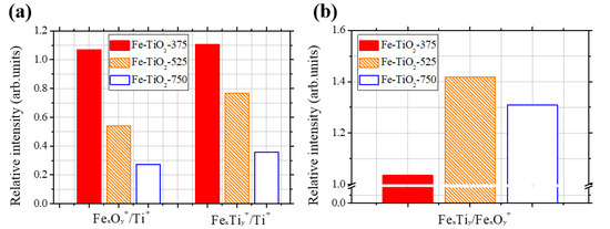 Results of TOF-SIMS analysis. (a) Secondary ion mass signals detected during TOF-SIMS analyses on Fe-TiO2-375, -525, and -750 samples are compared. Secondary ion mass signals are categorized into two categories (FeO+ and FeTi+), where each category is the sum of the ion mass signals containing the respective ions (e.g., FeO+ is the sum of the ion mass signals containing Fe and O). The FeO+ and FeTi+ signals of each sample were divided by the respective Ti+ signal. (b) FeTi+ signals of three samples divided by the respective FeO+ signals are compared.