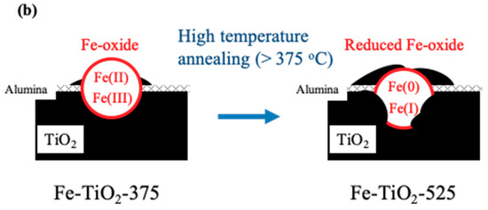 The stronger SMSI effect of TiO2 at higher temperatures (525 and 750 °C) not only facilitated the scrambling up of loaded Fe-oxide by the underlying TiO2 but also resulted in the reduction of the loaded Fe atoms by the inter-diffusion of metal atoms between the TiO2 and oxidized Fe structure (Figure 6b) [43,44,45,46]. The former effect made Fe atoms unavailable to the adsorbed oxygen or water molecules, while the latter made the charge transfer from TiO2 to Fe atoms difficult [47,48]. That is to say, the effects of the stronger SMSI between TiO2 and the loaded Fe-oxide at higher temperature resulted in the decrease in the charge separation efficiency of Fe-TiO2, although, in our case study, the reduction of the oxidation states of the Fe atoms seemed to be more critical for decreasing the charge separation efficiency, and photocatalytic activity of Fe-TiO2 upon higher temperature annealing (>375 °C).
