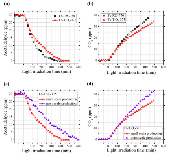 The results of the photocatalysis experiments (Fe-P25-750 and mass-produced Fe-TiO2-375). Concentration changes of (a) acetaldehyde and (b) CO2 as a function of the visible light irradiation (Table 2) and Fe-P25-750 samples. Concentration changes of (c) acetaldehyde and (d) CO2 as a function of the visible light irradiation time in the presence of Fe-TiO2-375 produced at small scale and mass-produced Fe-TiO2-375.