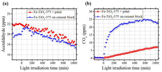 The results of the photocatalysis experiments (Fe-TiO2-375 mixed with paint or adhesive materials). Concentration changes of (a) acetaldehyde and (b) CO2 as a function of the visible light irradiation time in the presence of Fe-TiO2-375 mixed with paint or a surface hardening agent and spread on a stainless steel surface or on a cement block, respectively.