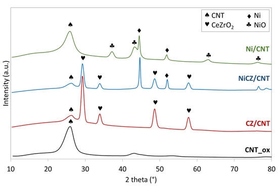 The X-ray diffraction (XRD) patterns for functionalized CNTs (denoted CNT_ox), CeZrO2/CNT (denoted CZ/CNT), NiCeZrO2/CNT (denoted NiCZ/CNT) and Ni/CNT catalysts are presented in Figure 1. The diffraction peak at ca. 26° visible for all samples is assigned to CNTs. Both the CZ/CNT and NiCZ/CNT diffractograms show reflexions at ca. 29.5, 33.9, 48.5 and 57.3° corresponding to (111), (200), (311) and (222) planes of CeZrO2, respectively.