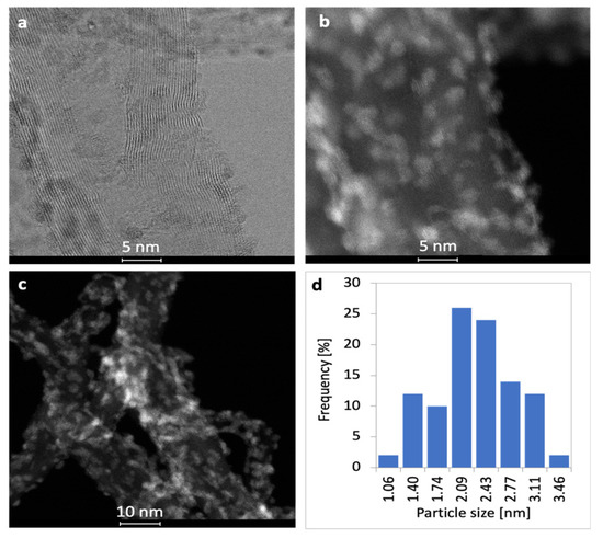 The dispersion of nickel phase on CNTs in Ni/CNT catalyst (Figure 3) is also good; however, the presence of two nickel fractions can be observed, i.e.,: (i) small-size, spherical, non-agglomerated crystallites of the mean diameter close to 5 nm, and (ii) larger agglomerates whose size exceeds 15 nm.