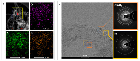 Combination of both active phases, i.e., Ni and CeZrO2 in NiCZ/CNT catalyst, also results in their good dispersion over the CNT support (Figure 4). It was detected by elemental mapping and selected area electron diffraction that Ni occurs in proximity to the Ce and Zr (Figure 5). This indicates strong contact between Ni and CeZrO2. It was determined, that the size of Ni-CeZrO2 particles varies from 1.06 to 3.46 nm, with a mean diameter of 2.11 nm (Figure 4b).