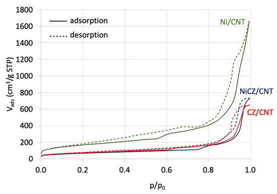 The N2 adsorption/desorption isotherms for CNT-supported CeZrO2, Ni and Ni-CeZrO2 are shown in Figure 6, and they are similar to type IV isotherm according to IUPAC classification. The occurrence of hysteresis loop visible for all samples prove the existence of mesopores. The textural properties of all samples, i.e., the specific surface area (SSA), the total pore volume (Vt), the volumes of micro-, meso- and macropores, and the average pore size (d), are presented in Table 1. The CeZrO2-containing catalysts (CZ/CNT and NiCZ/CNT) show significantly lower specific surface areas when compared to Ni/CNT, which can arise from higher loading of the active phase (CeZrO2 or Ni-CeZrO2) in those samples.