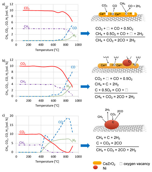 The performance of obtained catalysts in the DRM reaction was tested in the temperature-programmed (TP) conditions to determine the temperature range for the reaction (Figure 7), and in isothermal mode (Figure 8).