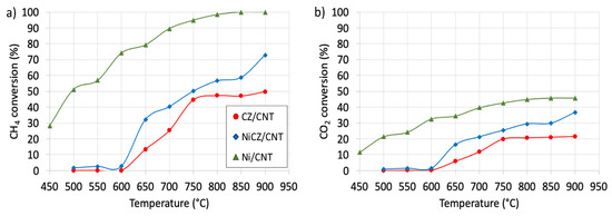 The CH4 and CO2 conversions during DRM after 2 h on-stream at each temperature over CZ/CNT, NiCZ/CNT and Ni/CNT are presented in Figure 8. The performance of Ni/CNT is significantly better than that of CZ/CNT and NiCZ/CNT catalysts. It shows 28 and 10% conversion of CH4 and CO2, respectively at a temperature as low as 450 °C, while the CZ/CNT and NiCZ/CNT catalysts are active in DRM above 600 °C. However, some minor activity can be observed in the 500–600 °C range for the latter. According to TEM observations, Ni and CeZrO2 remained in good contact; thus, one would expect such a catalyst to show at least similar activity to the Ni/CNT. The significantly lower performance of NiCZ/CNT compared to Ni/CNT may arise from the partial coverage of Ni crystals with CeZrO2; hence, not sufficient exposure of the Ni active sites for CH4 dehydrogenation. The most frequently used model for DRM is the Langmuir-Hinshelwood one, in which both the CH4 and CO2 are adsorbed on the surface. The most widely applied rate-determining step is CH4 decomposition and the surface reaction of two adsorbed species [49]. Reduced concentration of Ni sites accessible for CH4 adsorption in NiCZ/CNT compared to Ni/CNT will affect the DRM reaction. The Ni/CNT characterizes with very high SSA (about 2.3 times higher than for NiCZ/CNT) and the access of reagents to well-dispersed Ni nanocrystals is uninterrupted, making it very active in DRM.