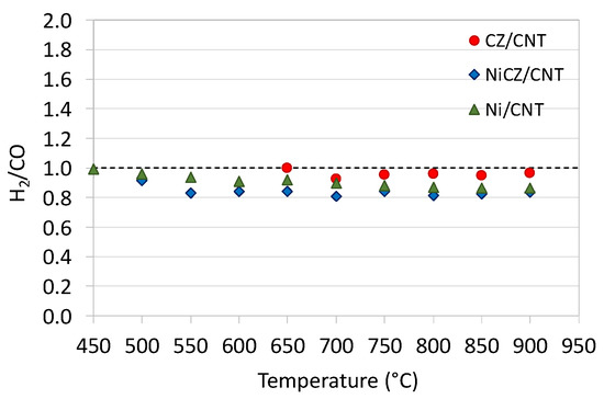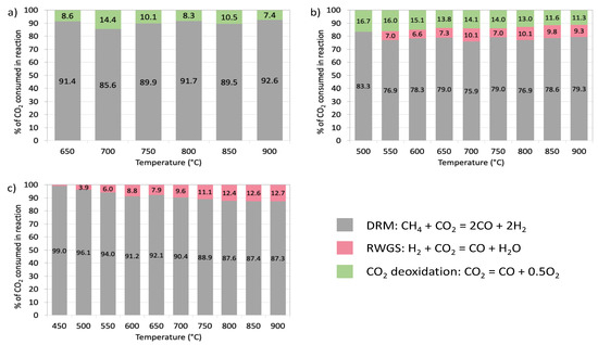 The occurrence of RWGS during DRM usually manifests by the H2/CO < 1, and such a phenomenon is observed in Figure 10. In addition, the decrease of H2/CO ratio can be caused by the CO2 deoxidation, that produces CO, thus decreases the overall contribution of H2 in the product gas. The reverse situation, i.e., the increase of H2/CO > 1, would speak either for the CH4 decomposition (Equation (3)) that generates more H2, or the Boudouard reaction (Equation (2)) that consumes CO. Both reactions can occur during DRM and result in carbon deposition. However, in the presented cases the H2/CO < 1.